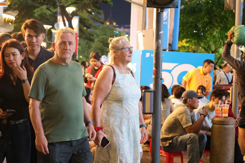 Nhiều du khách nước ngoài thích thú hòa mình vào dòng người tại trung tâm TP.Hồ Chí Minh để trải nghiệm không khí đêm giao thừa. Ảnh: Minh Anh.