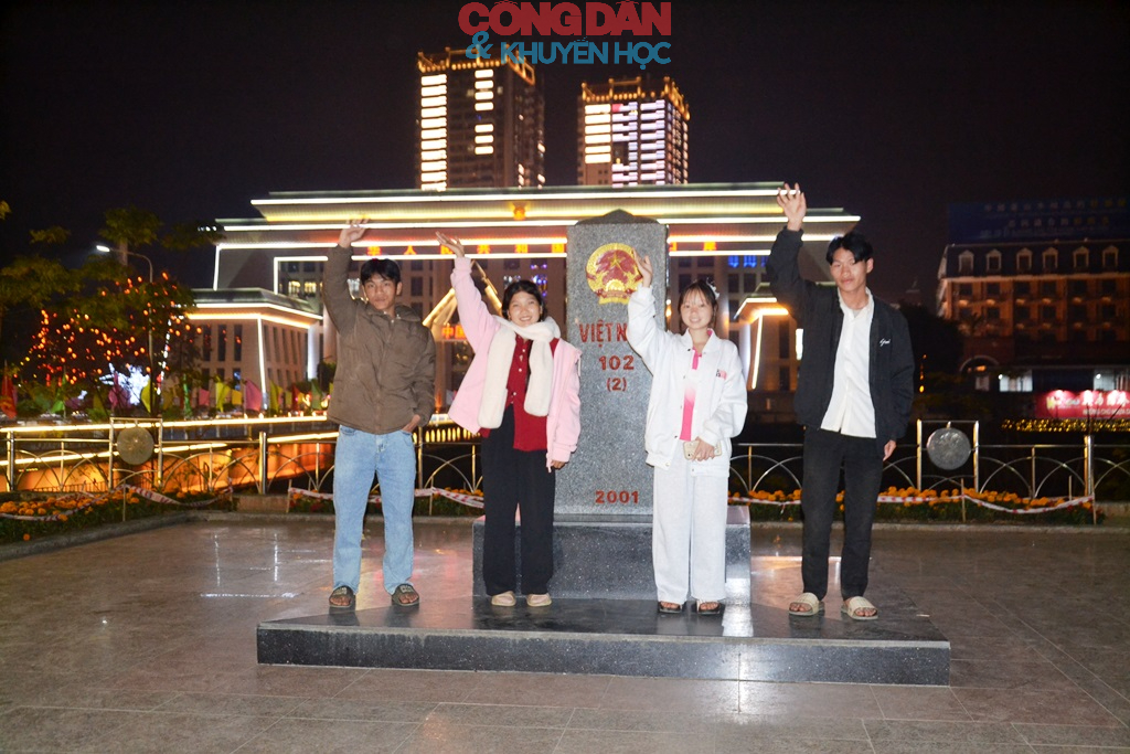 Các bạn trẻ chụp ảnh ngay bên cột mốc biên giới thời khắc Giao thừa đang đến gần. Ảnh: Quốc Hồng