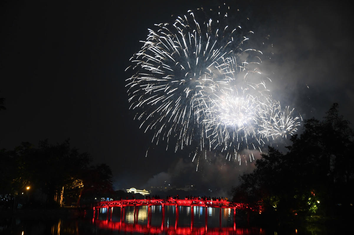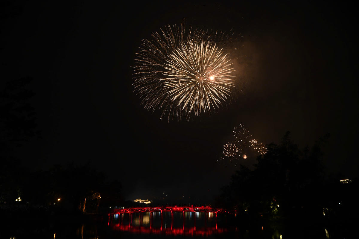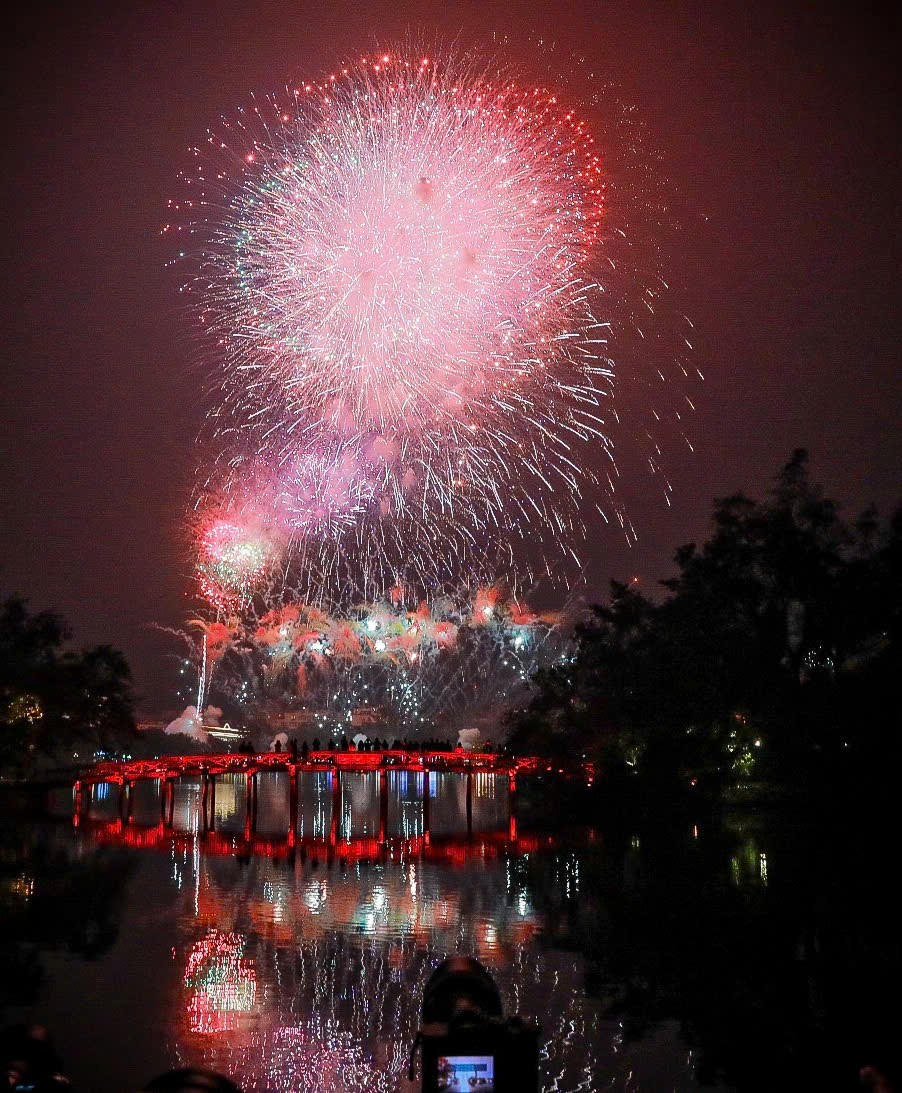 Những tràng pháo hoa tầm cao liên tiếp phản chiếu lên mặt nước Hồ Gươm tạo nên bức tranh thị giác đầy cuốn hút. Ảnh: Phạm Sỹ.