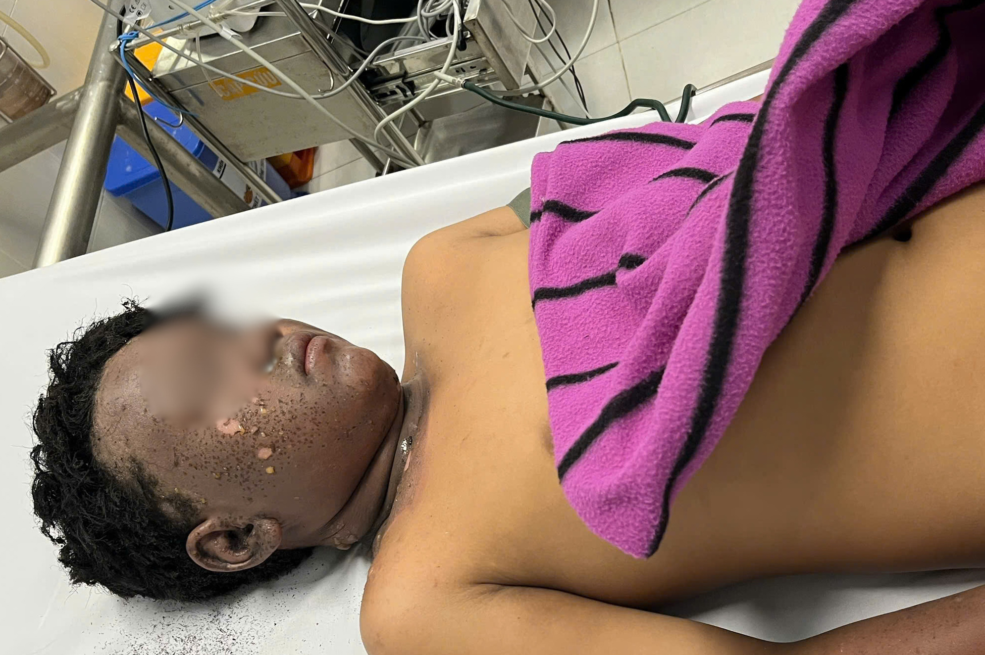 Gia đình phát hiện sự việc khi thấy con trai chạy về nhà với khuôn mặt bị thương. Sau khi rửa mặt bằng nước lạnh, nạn nhân được cha đưa lên TPHCM cấp cứu.