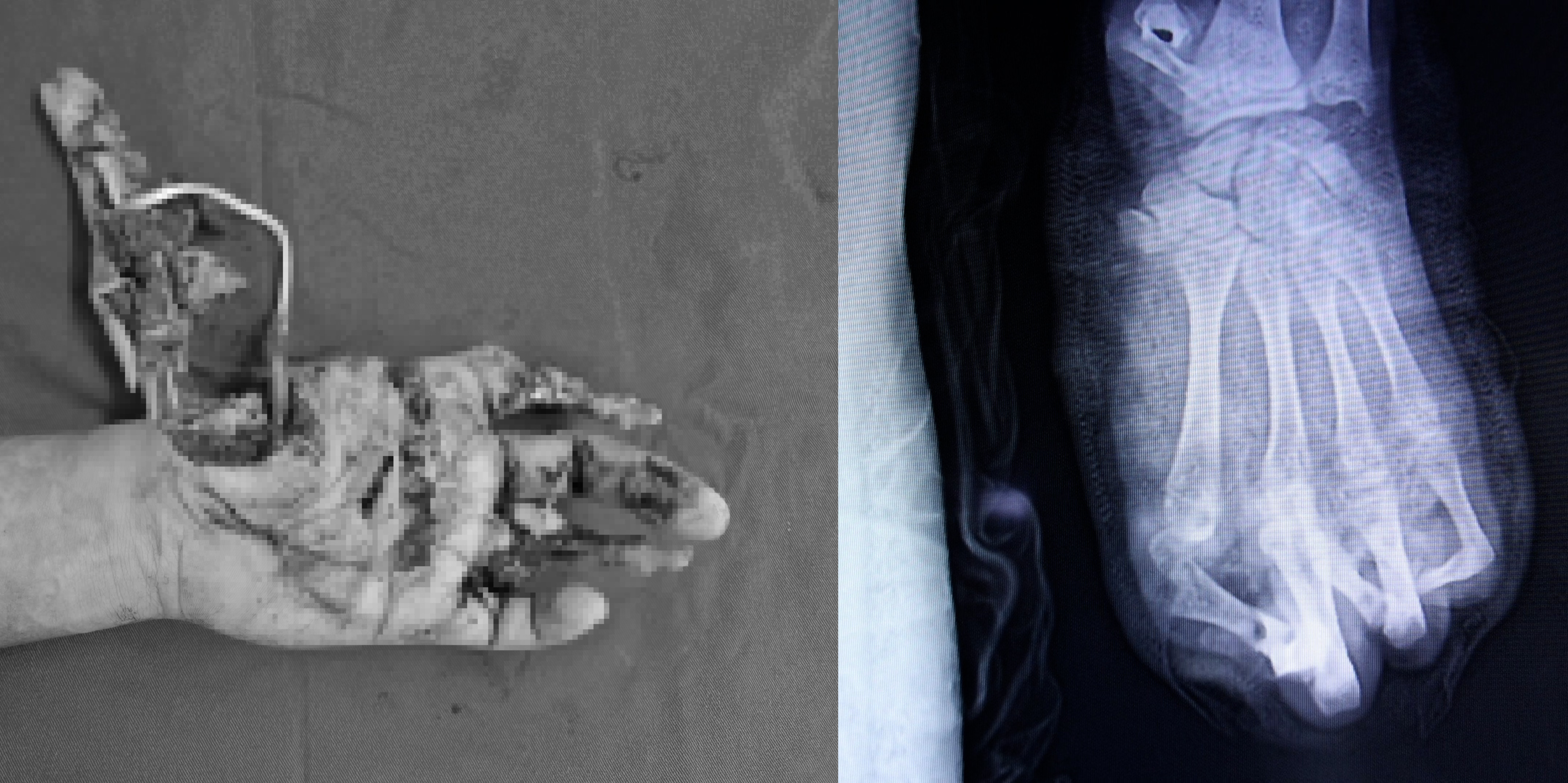 Toàn bộ vùng gan tay và cổ tay bị dập nát nặng, khiến quá trình điều trị dự kiến kéo dài và cần nhiều lần phẫu thuật tiếp theo. Tiên lượng lâu dài, chức năng bàn tay chỉ có thể phục hồi một phần rất hạn chế.