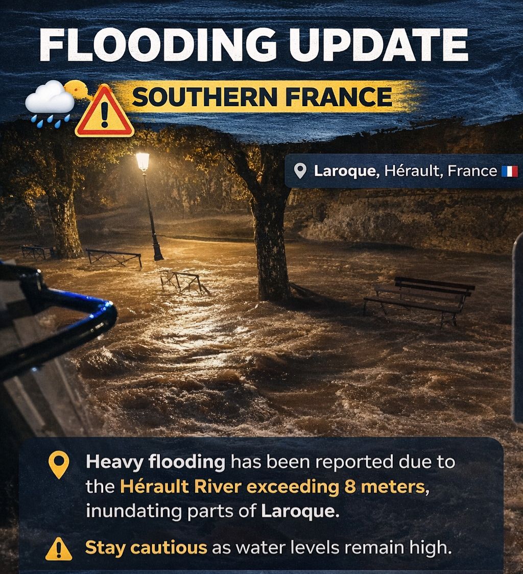 Cảnh báo đỏ áp dụng cho đoạn sông Hérault từ Pouzols đến Agde, nơi ghi nhận dòng chảy tăng mạnh trong thời gian ngắn, làm gia tăng nguy cơ ngập lụt trên diện rộng. Theo cơ quan khí tượng Météo-France, đợt thời tiết cực đoan này còn ảnh hưởng đến nhiều tỉnh miền Nam nước Pháp.