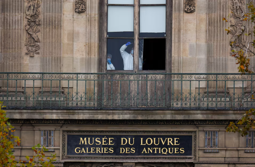 Nhóm pháp y đang kiểm tra một cửa sổ mà nhóm trộm sử dụng trong vụ cướp tại bảo tàng Louvre, ngày 19/10. Ảnh: Reuters.