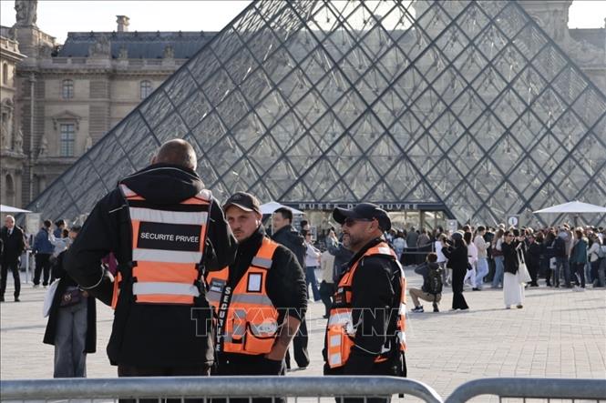 Lực lượng an ninh gác bên ngoài bảo tàng Louvre ở thủ đô Paris, Pháp ngày 22/10/2025. Ảnh: THX/TTXVN