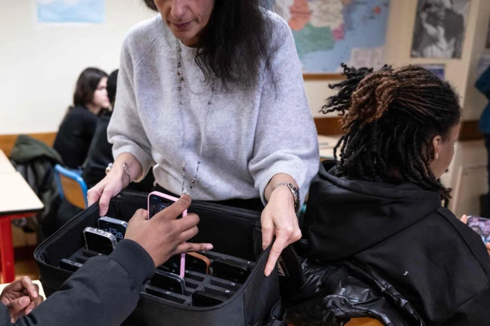 Một giáo viên thu điện thoại di động của học sinh tại trường trung học dạy nghề Jean Mermoz ở Montsoult, Paris, ngày 14/1. Ảnh: AFP