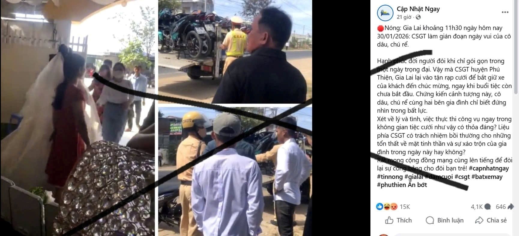 Lập tức, trên mạng xã hội đã xuất hiện thông tin không đúng sự thật, xuyên tạc khi cho rằng lực lượng CSGT đã vào tận rạp cưới thu giữ xe của một số khách đến chúc mừng khi đám cưới chưa bắt đầu "làm gián đoạn ngày vui của cô dâu, chú rể".