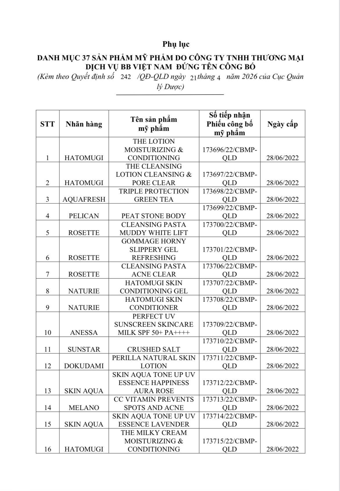 Theo Quyết định, Công ty TNHH Thương mại dịch vụ BB Việt Nam có trụ sở tại tầng 9, tòa nhà Diamond Flower (48 Lê Văn Lương, phường Yên Hòa, TP Hà Nội), đã thực hiện hành vi kinh doanh mỹ phẩm nhưng không có hoặc không xuất trình được hồ sơ thông tin sản phẩm (PIF) theo quy định khi cơ quan chức năng yêu cầu kiểm tra; vi phạm quy định tại Nghị định số 117/2020/NĐ-CP của Chính phủ về xử phạt vi phạm hành chính trong lĩnh vực y tế.