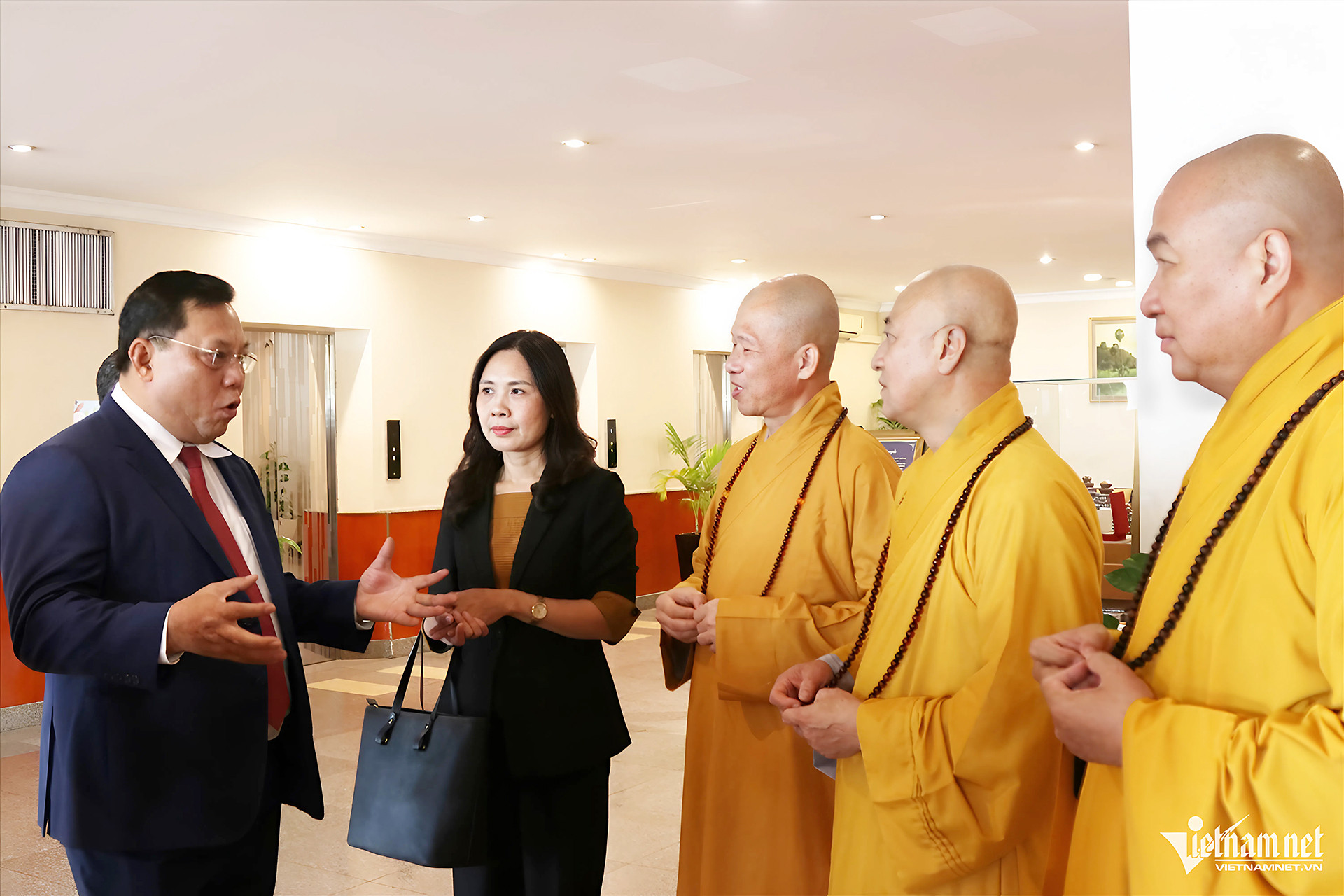 Thứ trưởng Bộ Dân tộc và Tôn giáo Nguyễn Hải Trung trao đổi cùng các vị đại biểu Phật giáo bên lề hội nghị. Ảnh: Mạnh Hà