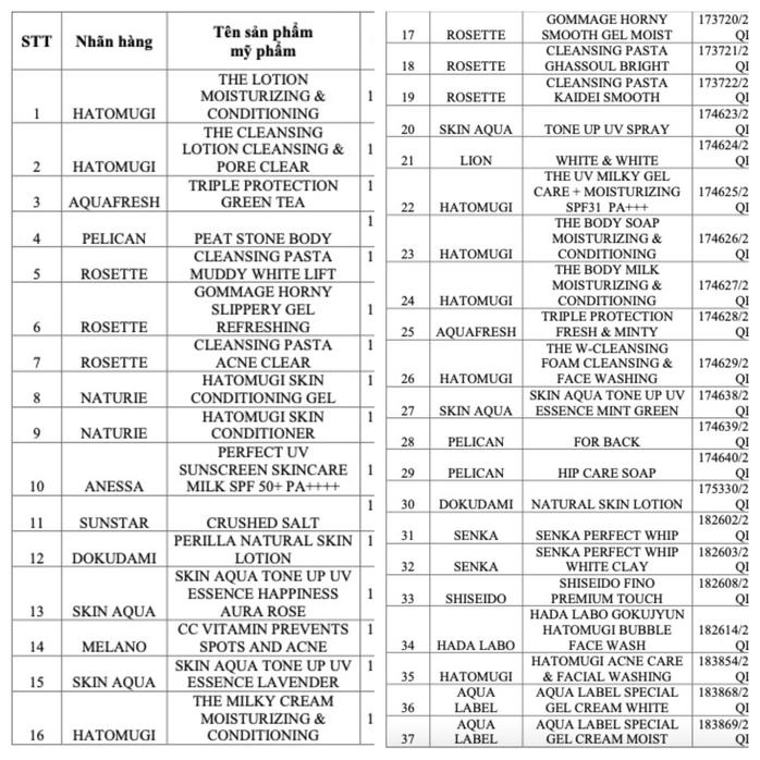 Danh sách các loại mỹ phẩm bị thu hồi. (Ảnh: Cục quản lý Dược).