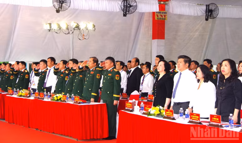 Các đại biểu thực hiện nghi lễ chào cờ tại lễ phát động "Chiến dịch 500 ngày đêm đẩy mạnh thực hiện tìm kiếm, quy tập và xác định danh tính hài cốt liệt sĩ".
