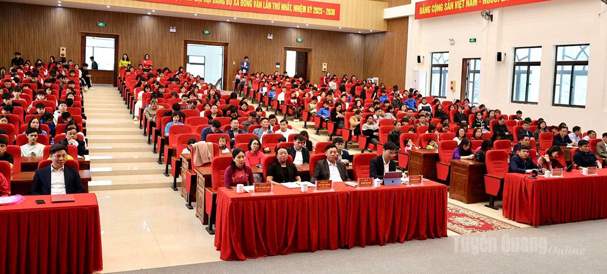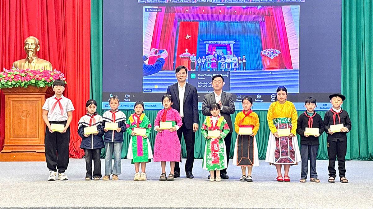 Lãnh đạo Sở Giáo dục và Đào tạo và xã Đồng Văn tặng quà cho học sinh có hoàn cảnh khó khăn.