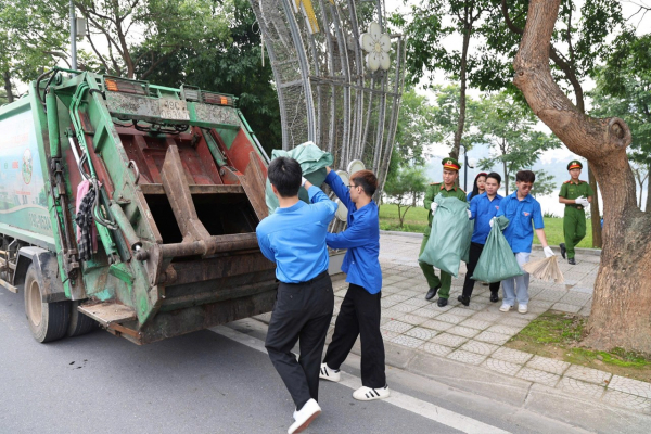 Đoàn viên, sinh viên Đại học Hùng Vương tích cực đồng hành cùng CBCS Công an tỉnh Phủ Thọ thu gom rác thải, làm sạch môi trường tại Công viên Văn Lang, phường Việt Trì.