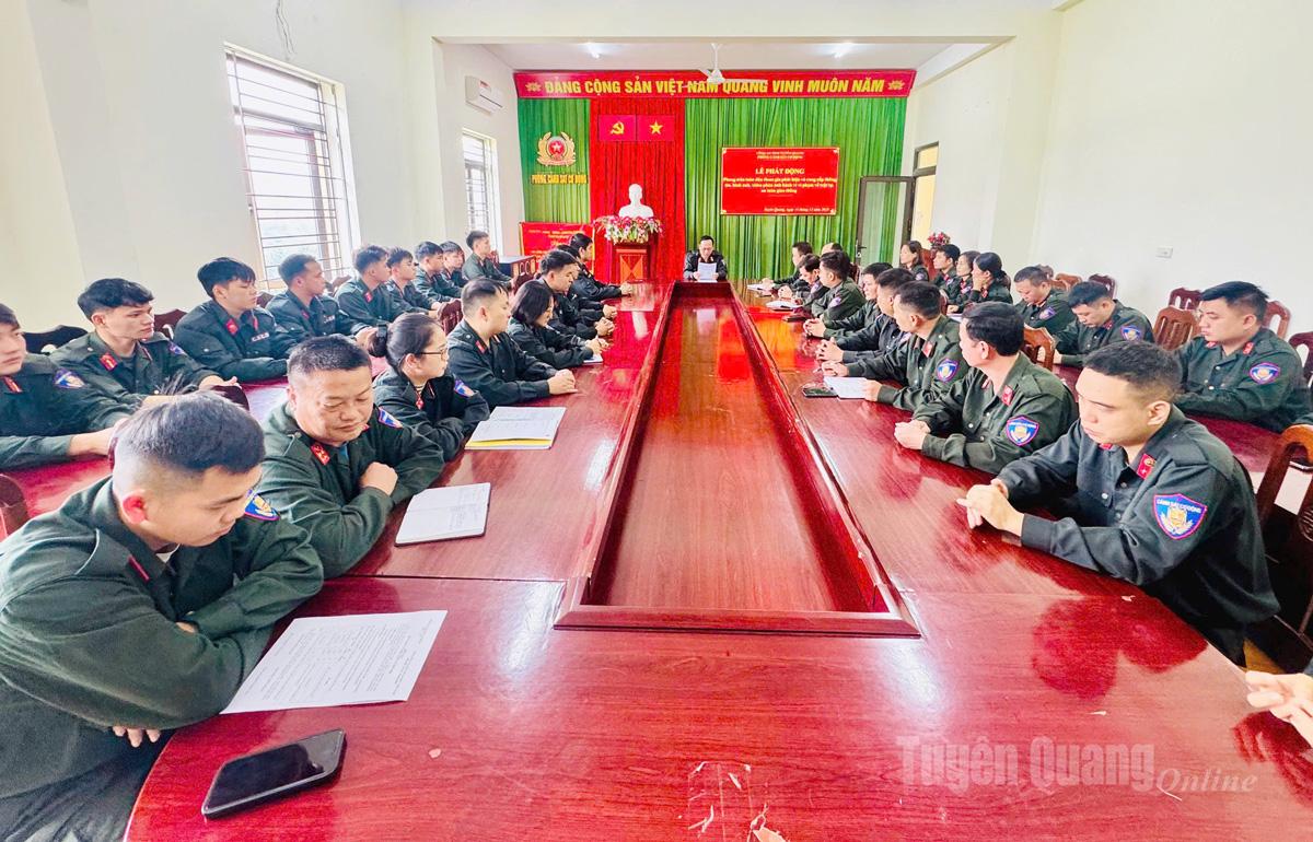Cán bộ, chiến sĩ Phòng Cảnh sát cơ động tại cơ sở phường Hà Giang 2 tham dự buổi phát động.