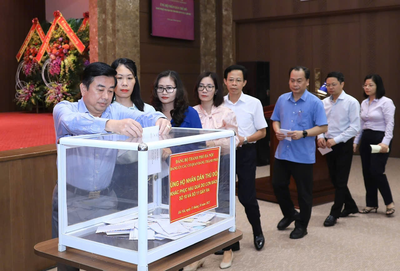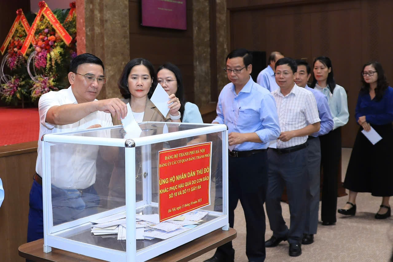 Cán bộ, đảng viên thuộc Đảng ủy các Cơ quan Đảng thành phố Hà Nội ủng hộ nhân dân Thủ đô khắc phục hậu quả do bão số 10 và 11 gây ra. Ảnh: Quang Thái