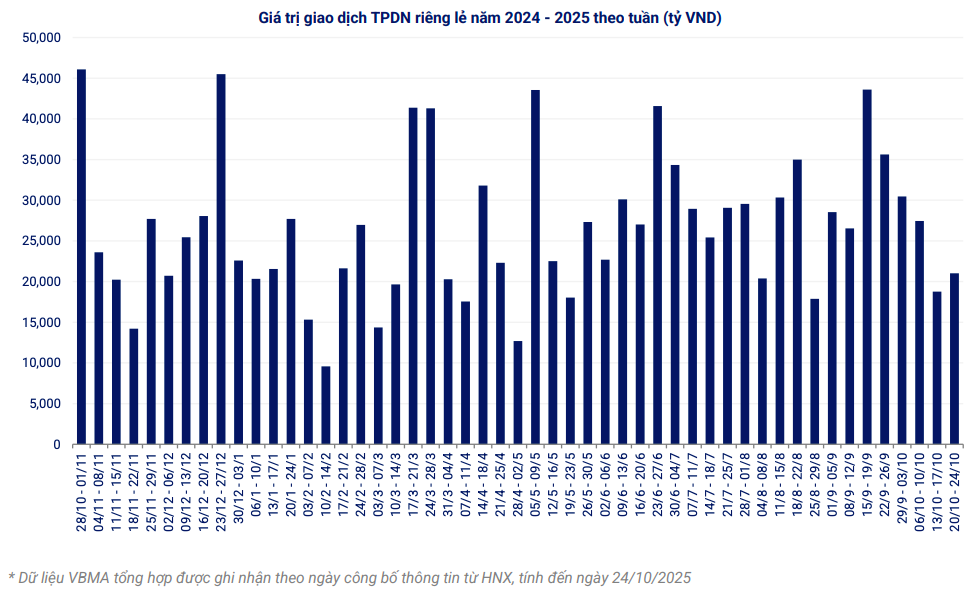 Trên thị trường thứ cấp, thanh khoản tiếp tục được cải thiện. Trong tuần, giá trị giao dịch trái phiếu doanh nghiệp riêng lẻ bình quân đạt 4.203 tỷ đồng/ngày, tăng 12% so với tuần trước. Tính từ đầu năm, tổng giá trị giao dịch trái phiếu phát hành riêng lẻ đạt khoảng 1.091 nghìn tỷ đồng.