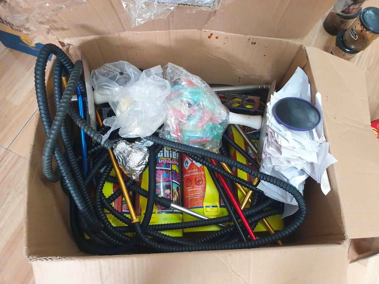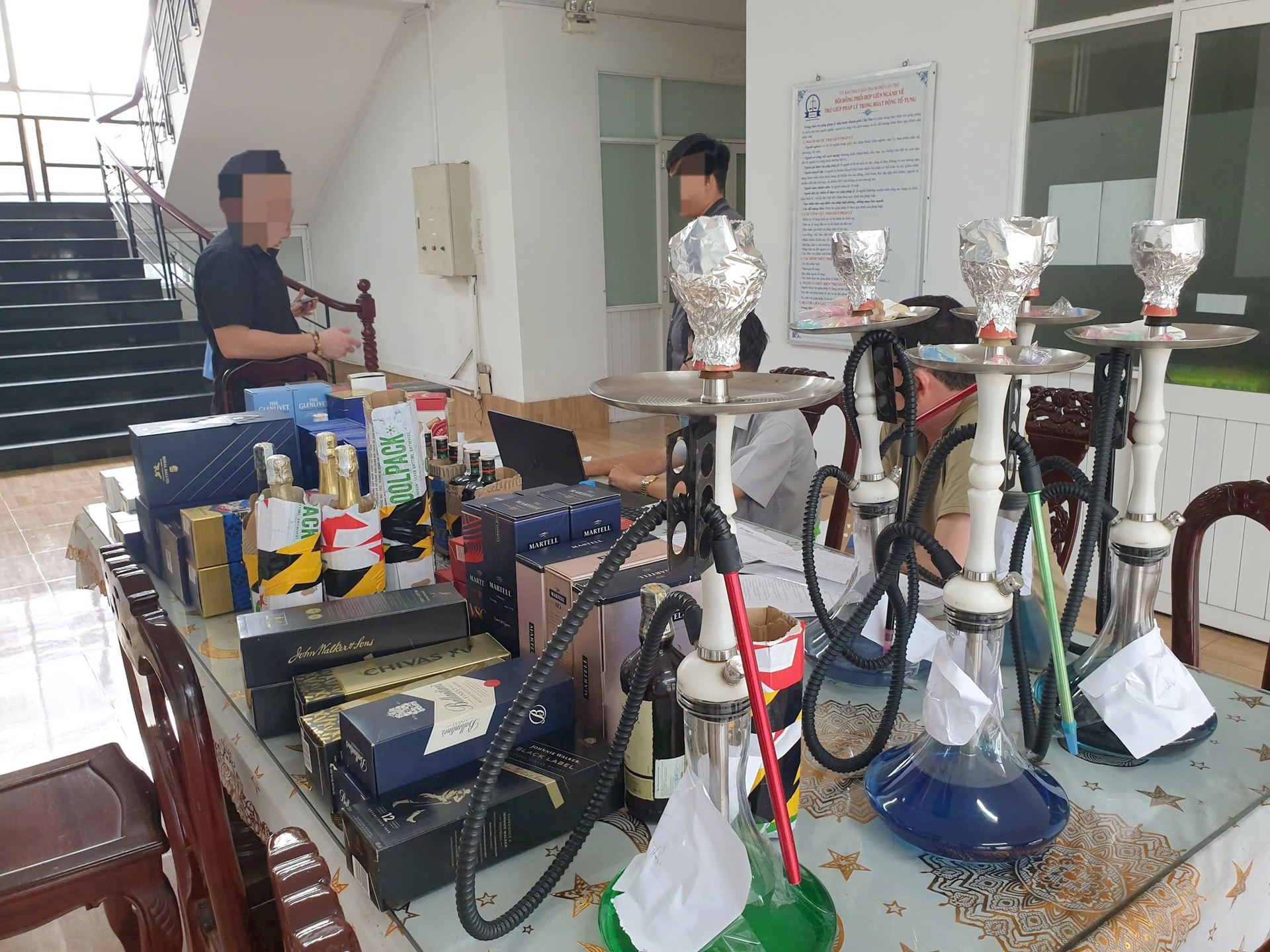 Cơ quan công an đã lập biên bản tạm giữ nhiều tài liệu, đồ vật có liên quan như bình chứa khí Nitrous oxide, dụng cụ pha chế, sử dụng shisha, rượu ngoại, …