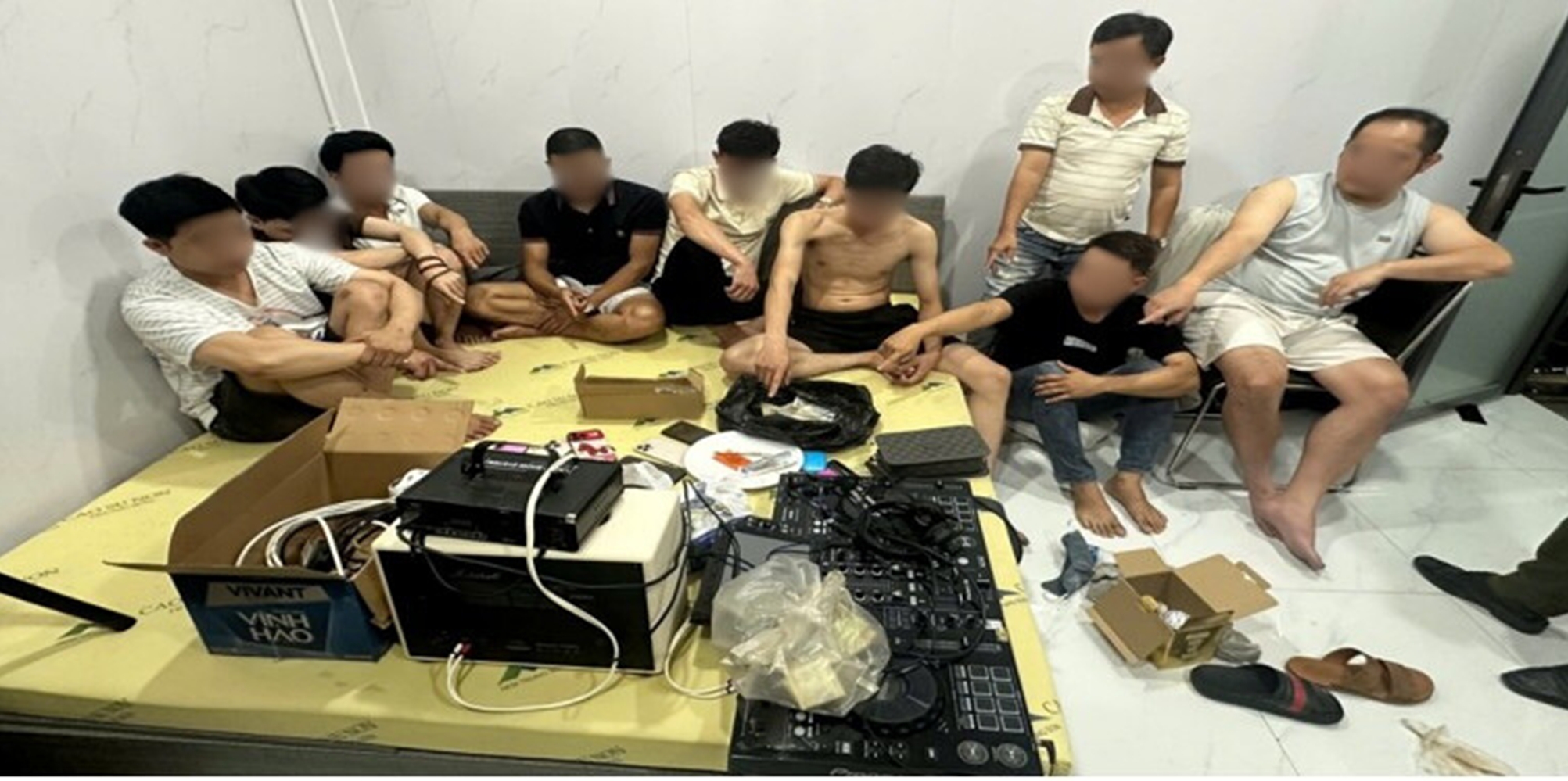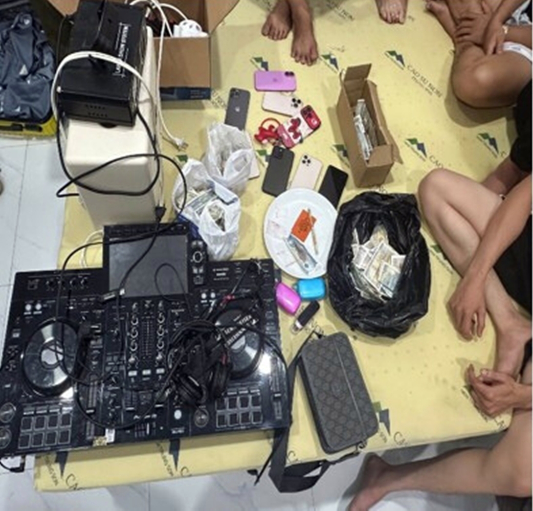 Kiểm tra tại chỗ, công an thu giữ hàng loạt "đồ nghề" phục vụ cho tiệc ma túy bao gồm: Dĩa sứ dùng để chia nhỏ thuốc, thẻ nhựa để "ke" ma túy, các tờ tiền cuộn tròn dùng làm ống hút, cùng hệ thống loa, đèn laser hiện đại phục vụ cho cuộc vui thác loạn.