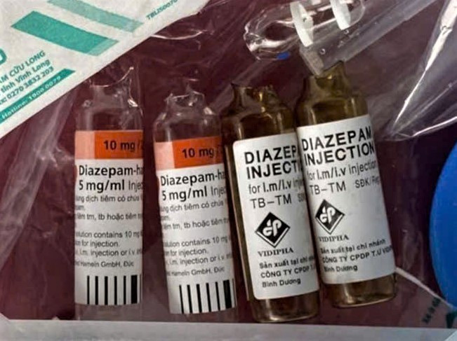 Kim tiêm cùng một số lọ thuốc gần thi thể nạn nhân.
