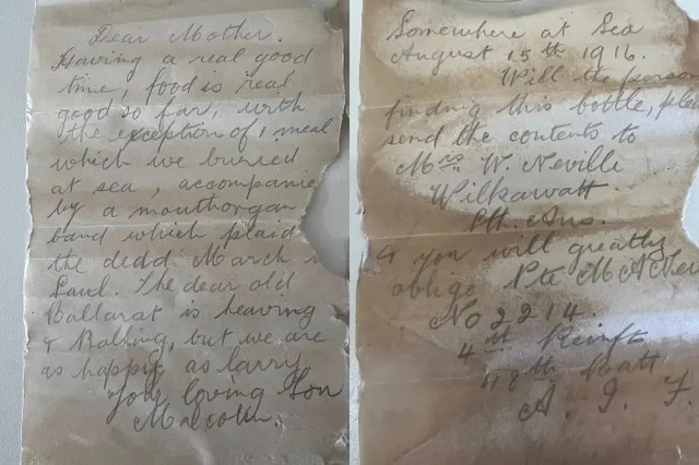 Hai lá thư trong chai do những người lính Úc viết cách đây hơn một thế kỷ.
