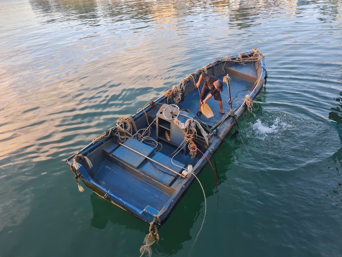 Đáng chú ý, mạn trái và mạn phải thuyền có chữ nước ngoài màu trắng, bên trên có một số vật dụng câu cá.