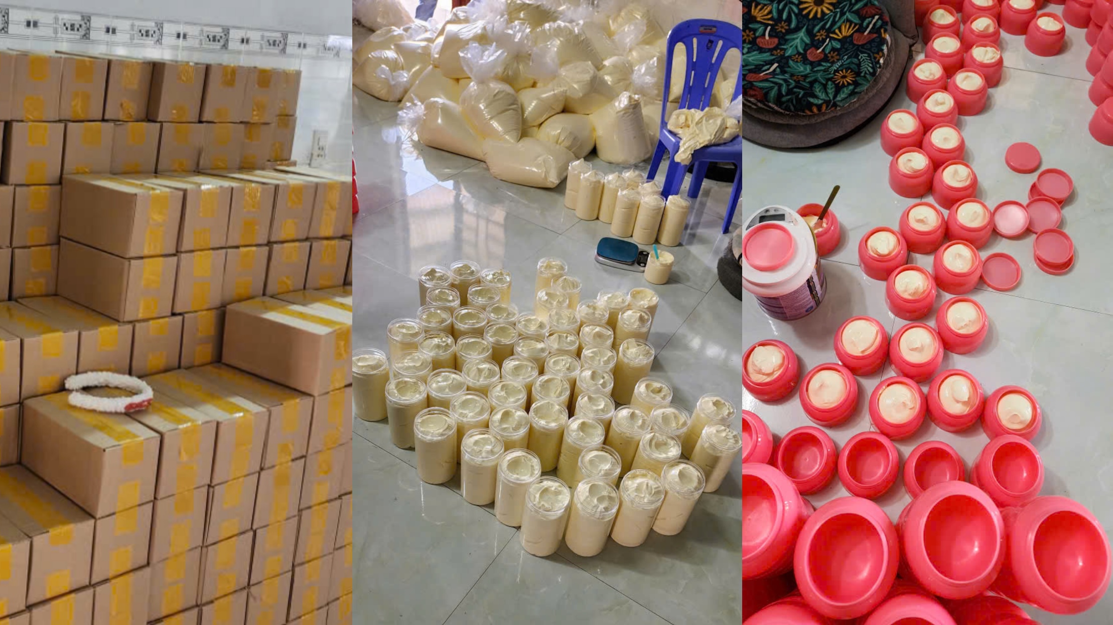 Tại đây, lực lượng chức năng phát hiện bà TKV (36 tuổi, ngụ phường Phú Tân, tỉnh Vĩnh Long) đang tổ chức sản xuất mỹ phẩm dạng “kem trộn” với số lượng lớn để kinh doanh trên mạng xã hội.