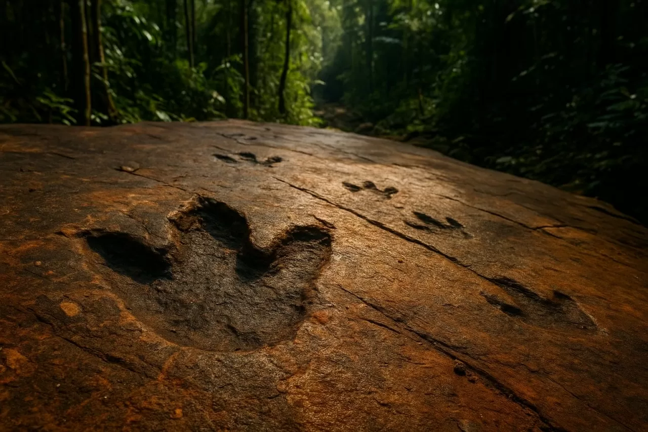 Các dấu chân hóa thạch của khủng long có niên đại khoảng 110 triệu năm được phát hiện trong các tầng đá cổ ở thị trấn Bonfim, bang Roraima, phía Bắc Brazil. (Ảnh: IA)