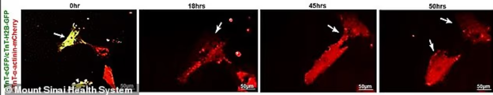 Hình ảnh chụp từ kính hiển vi. Từ trái sang phải: tế bào trong ảnh đầu tiên được lấy từ tim của một người hiến tặng 55 tuổi. Sau 18 giờ, tế bào đang phân chia sau khi tiếp nhận Cyclin A2 và quá trình phân chia diễn ra ngay sau đó. Sau 45 giờ, tế bào cơ tim chuẩn bị tách ra thành hai tế bào con. Hình cuối cùng là kết quả của quá trình này: sau 50 giờ, tế bào ban đầu đã hoàn toàn phân tách thành hai tế bào riêng biệt.