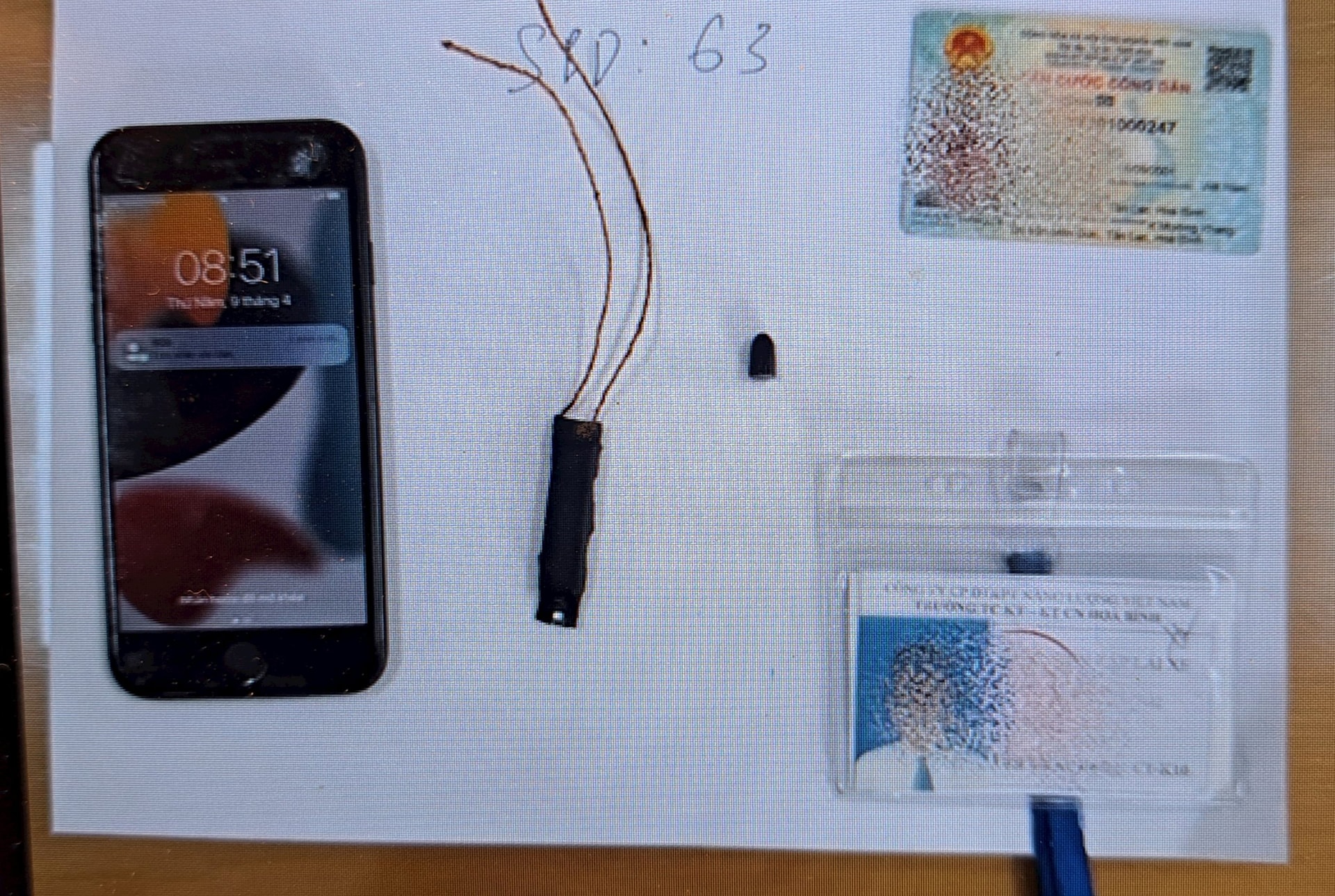 Thí sinh B.D.C (SN 2001, trú xã Tân Lạc, tỉnh Phú Thọ, SBD 63) sử dụng điện thoại di động, thiết bị thu phát sóng và tai nghe không dây siêu nhỏ để gian lận phần thi lý thuyết. Ảnh: Cục CSGT