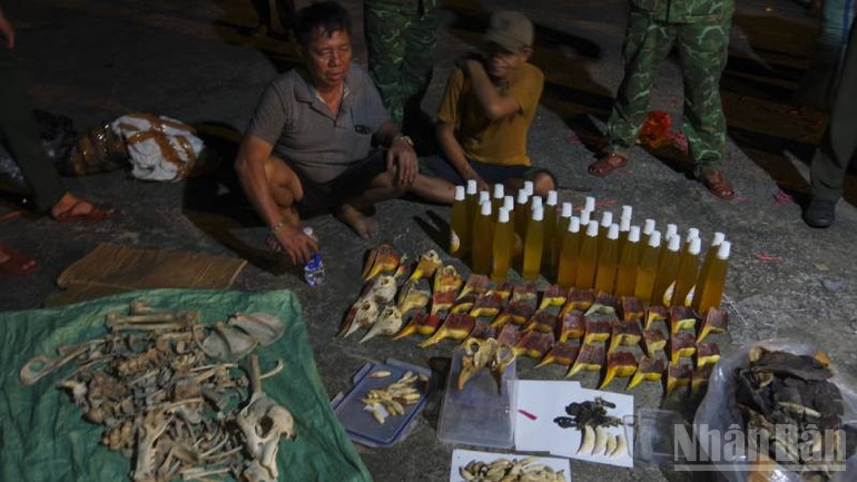 Lực lượng tuần tra tiến hành kiểm soát, phát hiện trên hai phương tiện chở hơn 4,2 tấn vảy động vật nghi ngờ là vảy tê tê, 150 bộ da trăn, 40kg mật động vật, hơn một tấn thịt ốc khô, gần 1,6 tấn da cá, 17,5kg còi ốc, 36kg xương động vật, 100kg da động vật chưa xác định chủng loại, 2,3kg mang cá, 39 mỏ chim, 210 răng động vật và 30 chai mang nhãn mác mật ong.