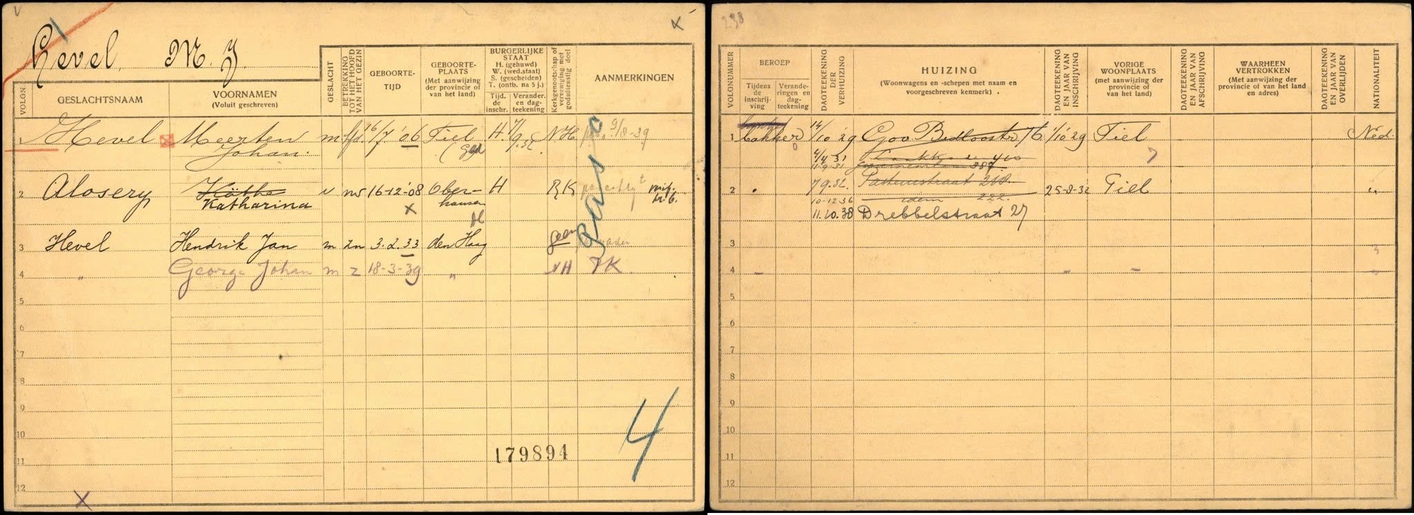 Katharina Alosery (sinh năm 1908 tại Oberhausen, Đức), Hendrik Jan Hevel (sinh năm 1933 tại The Hague, Hà Lan) và George Johan Hevel (sinh năm 1939, cũng tại The Hague) là bản ghi chính thức về gốc gác của gia đình nhà Hevel.