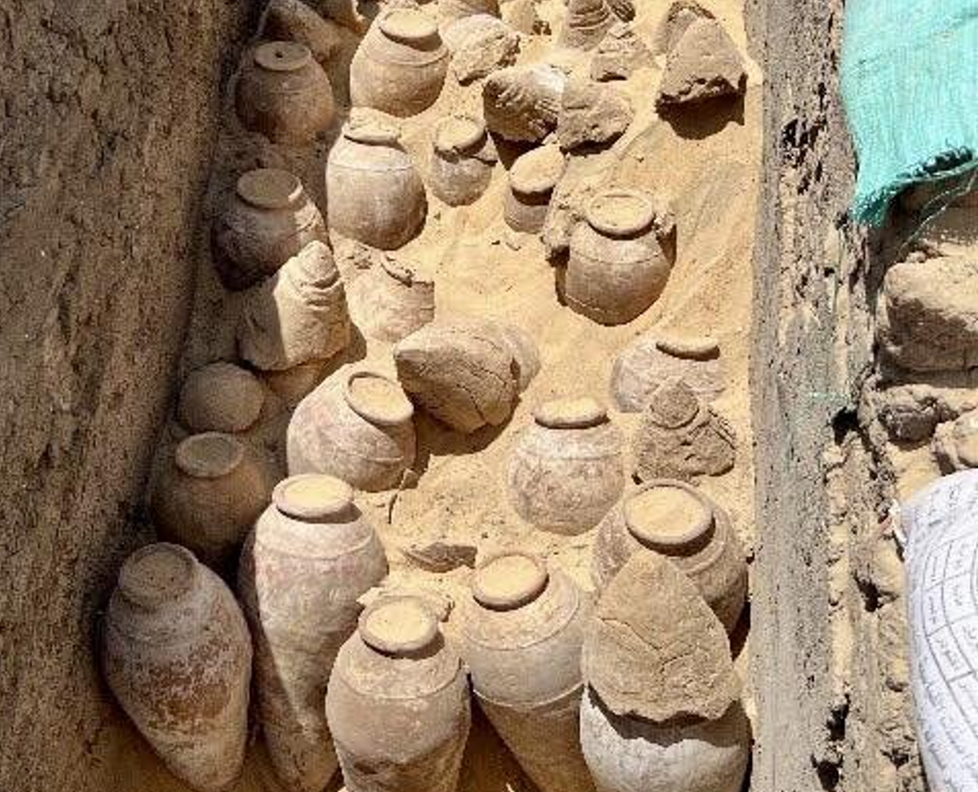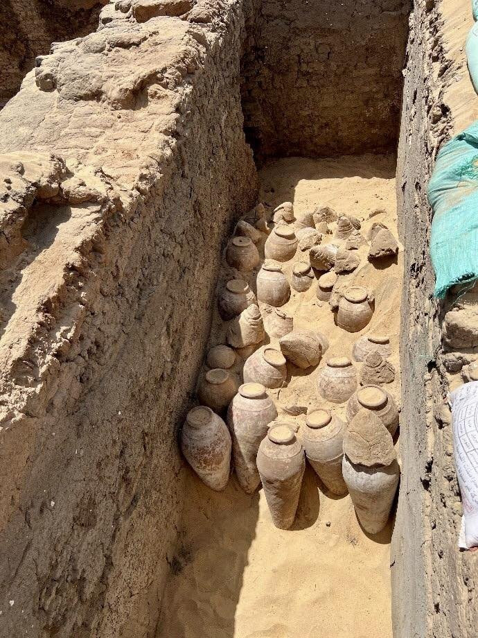 Đó là hàng trăm bình rượu và đồ tùy táng ước tính có niên đại khoảng 5.000 năm tuổi. Ảnh: @Hội Đồng Cổ Vật Tối Cao Ai Cập.