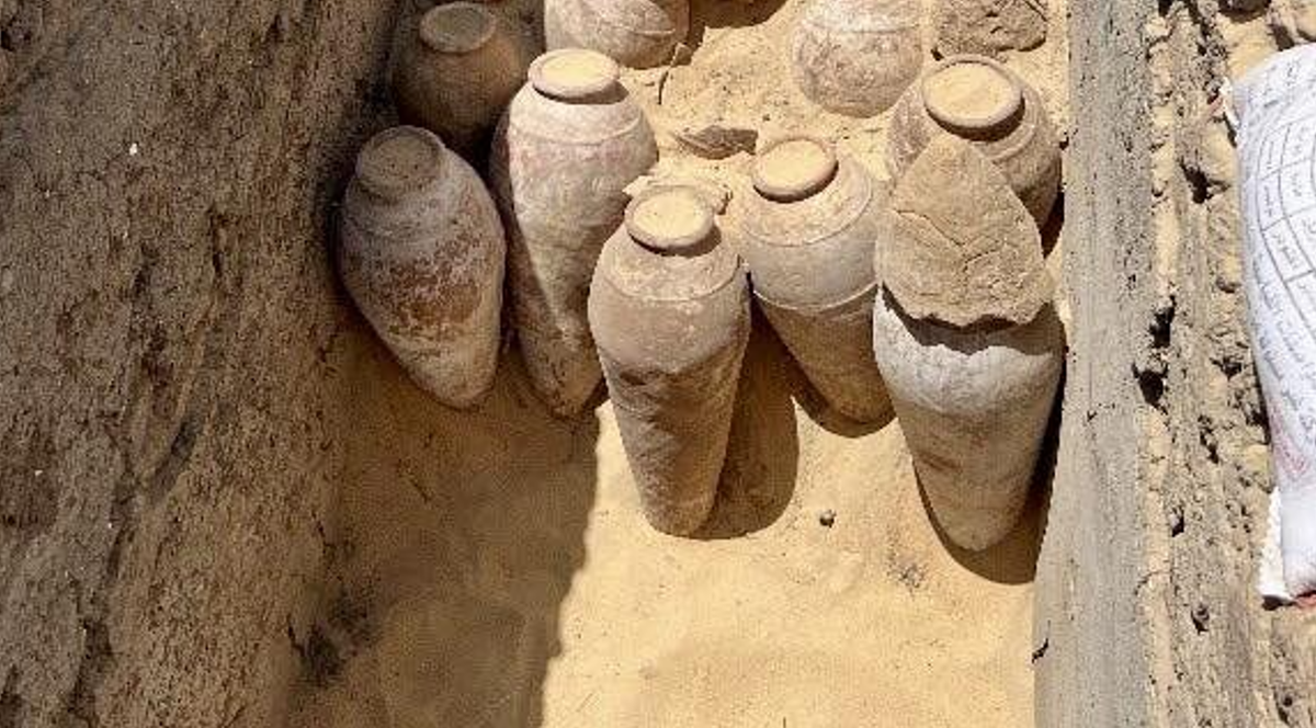 Một số bình rượu lớn được khai quật có nắp đậy còn nguyên vẹn. Những chiếc bình được bảo quản tốt mang đến cái nhìn độc đáo về quá khứ, hé lộ những tập tục ẩm thực và văn hóa của một thời đại mà Meret-Neith đã từng sinh sống. Ảnh: @Hội Đồng Cổ Vật Tối Cao Ai Cập.