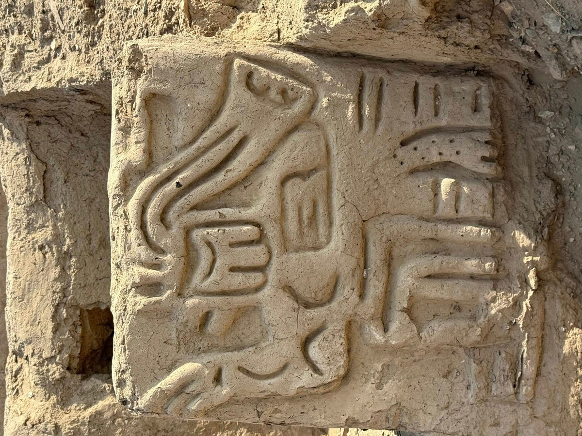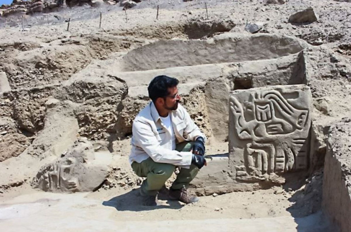 Yếu tố trung tâm là một cầu thang dẫn lên sân khấu hoặc bệ thờ ngôi đền, có thể là điểm tập trung cho các nghi lễ. Họ còn phát hiện một tác phẩm chạm khắc nhân hóa con người kết hợp các yếu tố từ nhiều loài sinh vật kỳ dị khác nhau. Ảnh: @Bộ Văn hóa Peru.