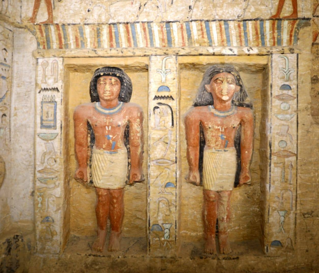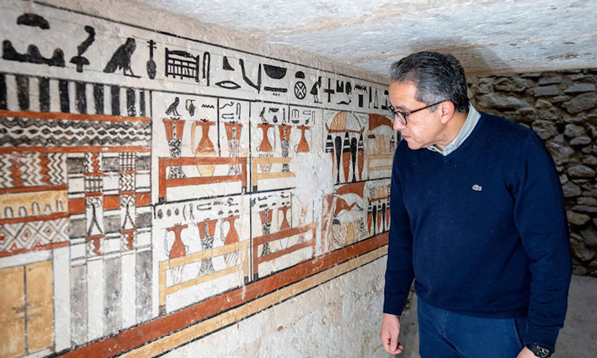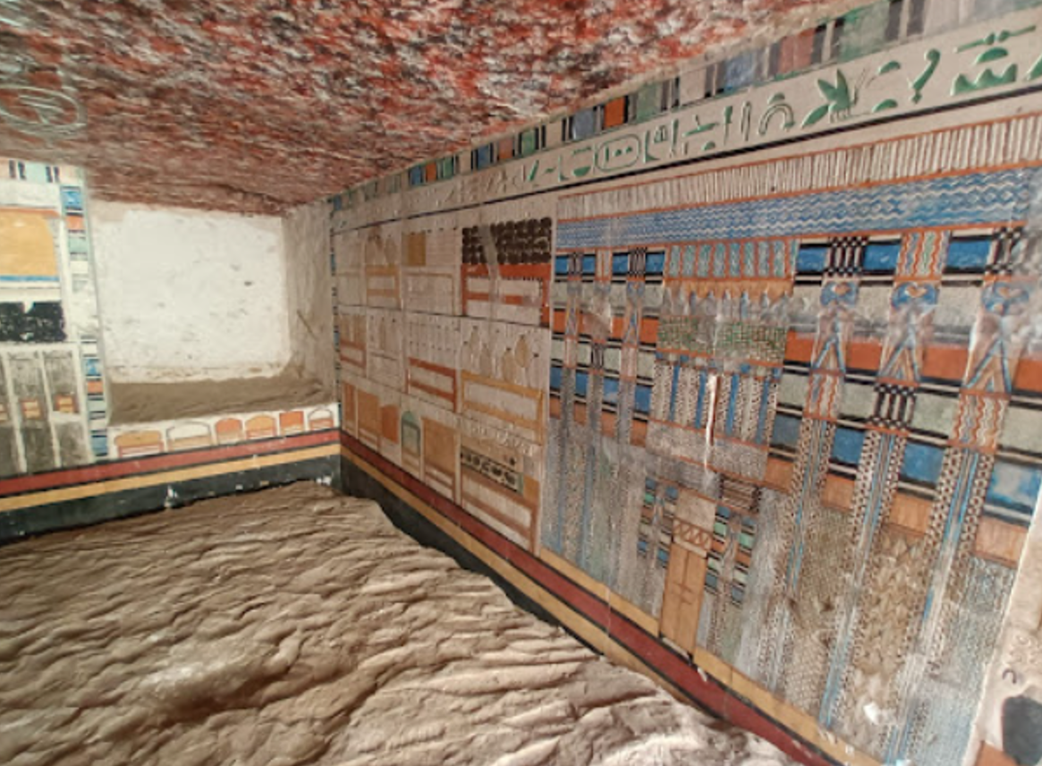 Lăng mộ đầu tiên thuộc về một viên chức cấp bậc Iry, bao gồm một đường hầm chôn cất sâu dẫn đến một căn phòng được trang trí bằng các cảnh tang lễ mô tả bàn lễ, bảy loại dầu thánh, và khảm tranh mặt tiền cung điện. Một chiếc quách bằng đá vôi cũng được phát hiện bên trong lăng mộ này. Ảnh: @Bộ Du lịch và Cổ vật Ai Cập.