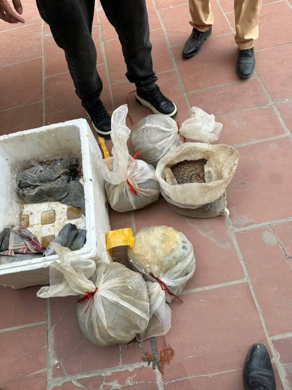 Tiến hành dừng kiểm tra, lực lượng chức năng phát hiện trên xe chở 12 cá thể tê tê giấu trong 2 thùng xốp lớn cùng 5 bao dứa quả cau khô.