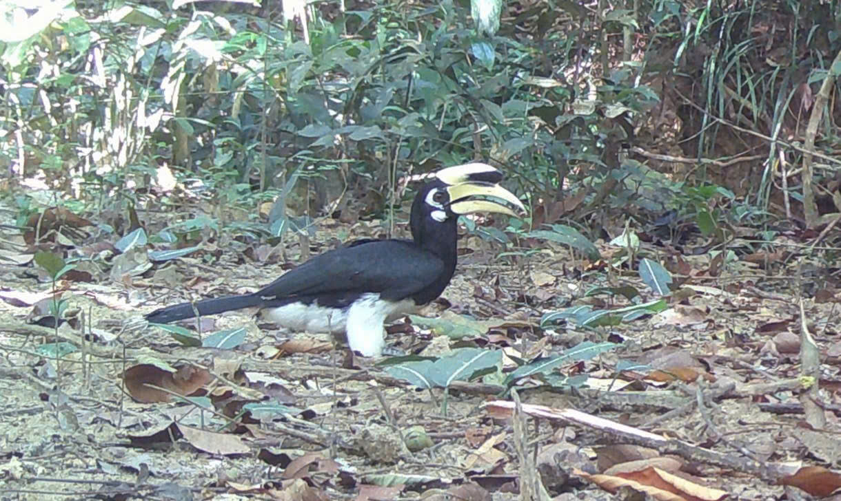 Theo đó, bẫy ảnh ghi nhận 1 cá thể chim hồng hoàng, đây là loài chim lớn, sống trên cây, lúc trưởng thành có thể nặng tới 3kg, sải cánh dài gần 1m. Hình ảnh được ghi lại khi cá thể này xuống đất kiếm ăn.
