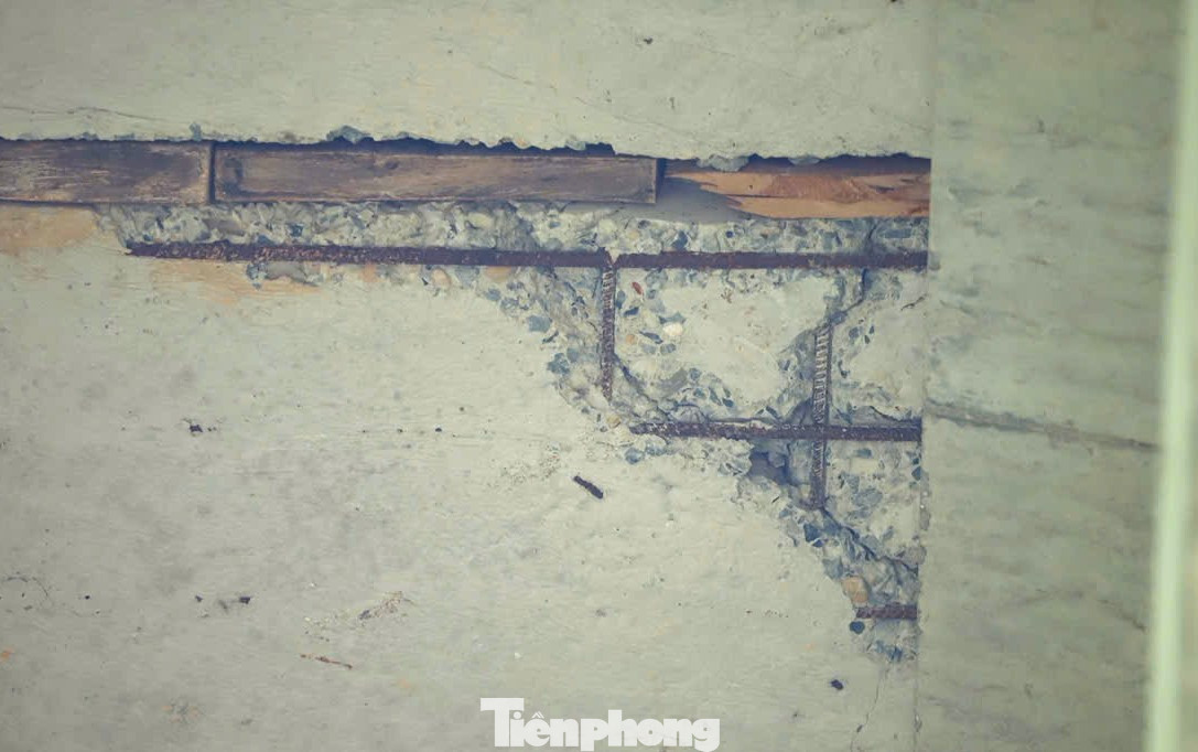 Một số cọc bong tróc lớp bê tông bảo vệ, nhiều mảng sứt mẻ lớn để lộ thép chịu lực gỉ sét.