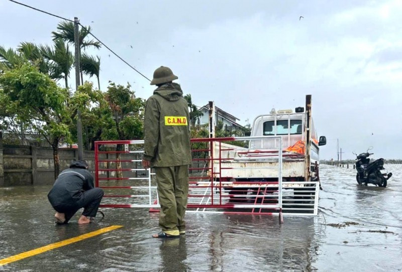 Lực lượng chức năng phường Kim Trà (TP Huế) túc trực, chốt chặn tại các tuyến đường ngập lụt để đảm bảo an toàn.
