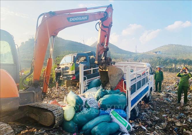 Lực lượng chức năng tiến hành tiêu hủy số nội tạng động vật không rõ nguồn gốc, xuất xứ. Ảnh: TTXVN phát