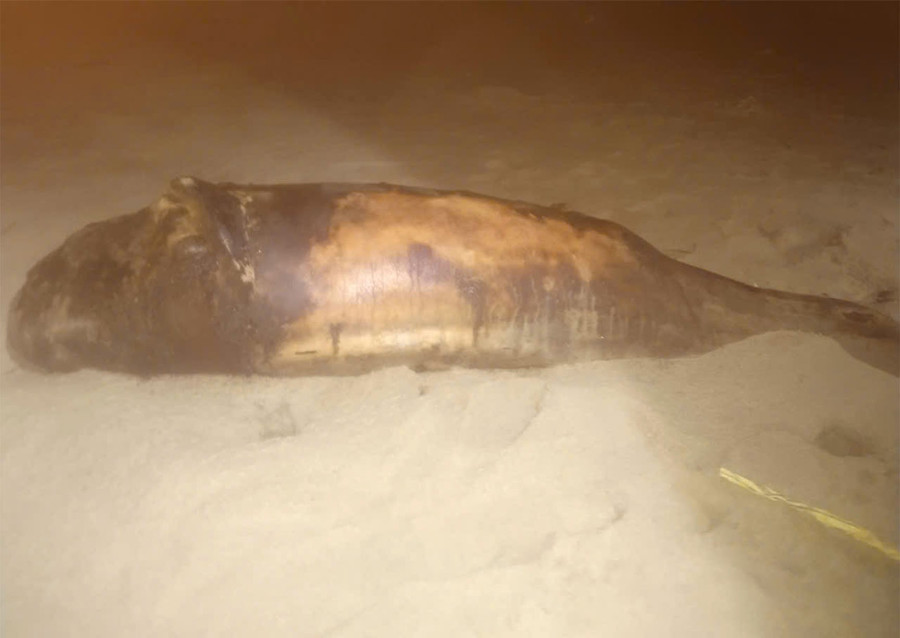Con cá voi dài 1,5 m, nặng hơn 30 kg. Nhiều vùng da trên thân cá bị trầy xước, bong tróc.
