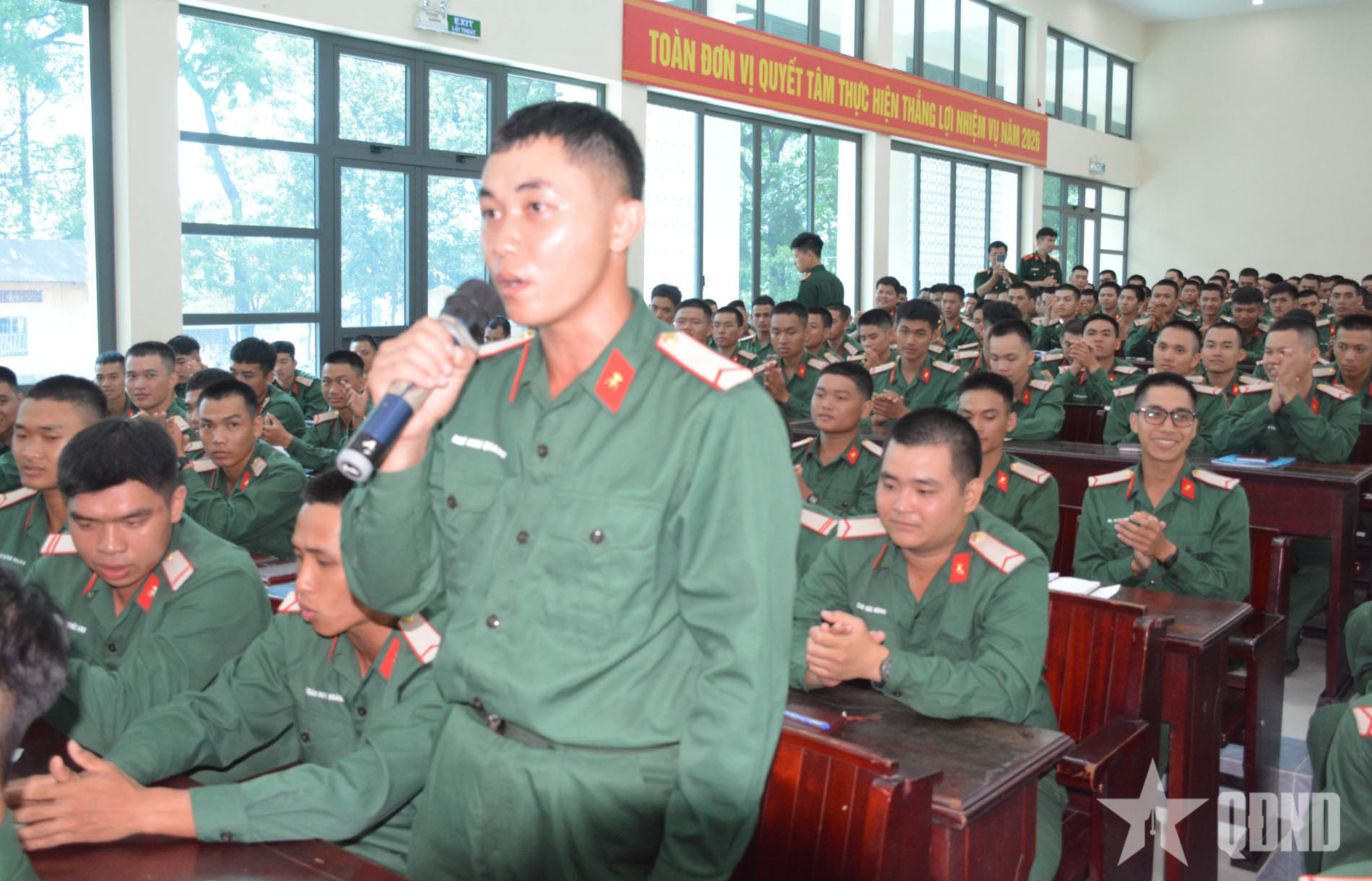Chiến sĩ mới phát biểu tại buổi đối thoại.