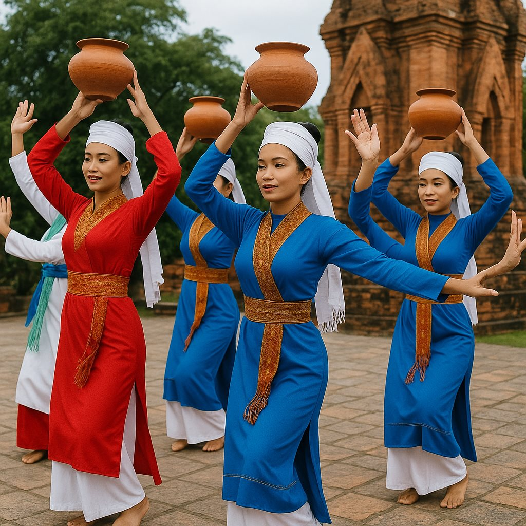 Các nghệ sĩ người Chăm biểu diễn múa truyền thống trong trang phục rực rỡ, đội chum trên đầu tại khu di tích tháp Chăm cổ, thể hiện nét đẹp văn hóa đặc trưng của dân tộc Chăm. Ảnh: ST
