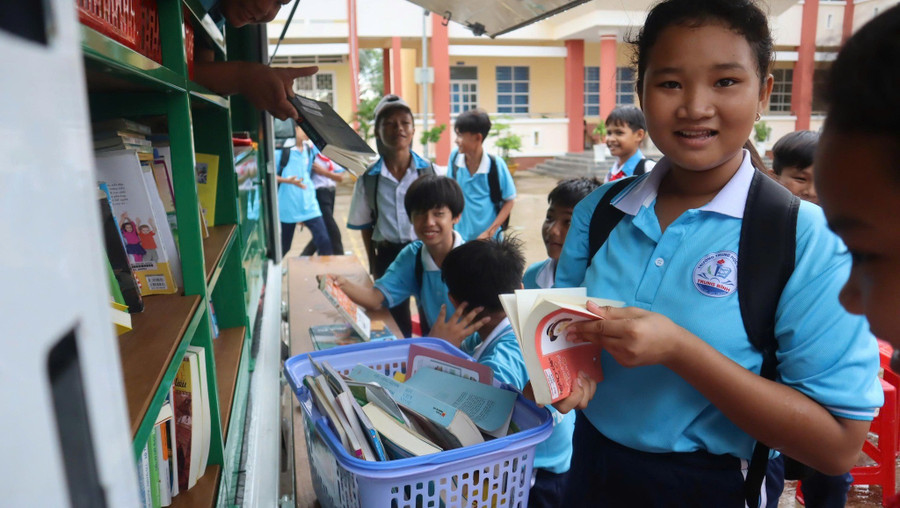 HS Trường THCS Trung Bình (xã Trần Đề, TP Cần Thơ) tham gia Ngày hội sách “Chuyến xe tri thức” năm 2025.