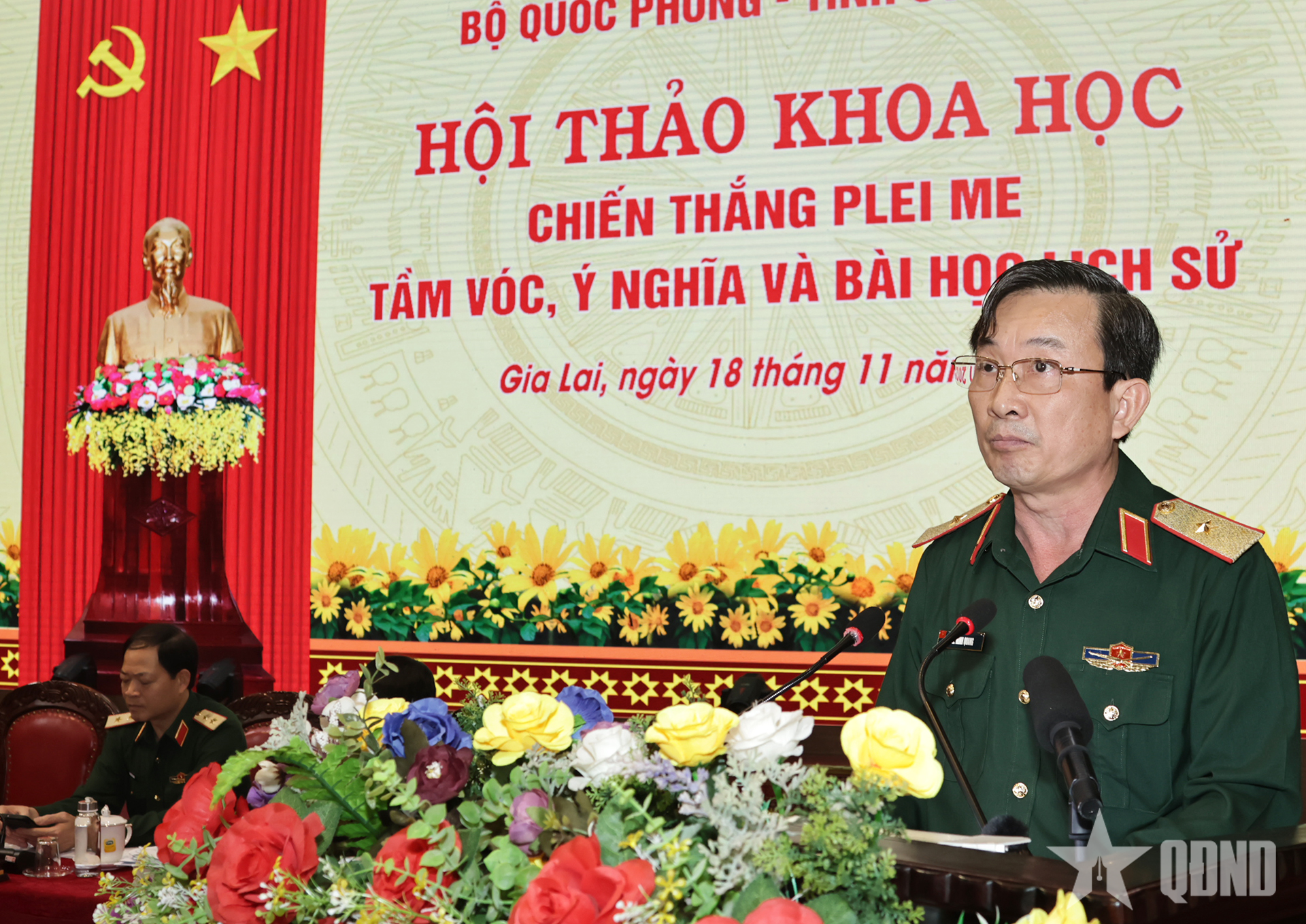Thiếu tướng Lê Minh Quang, Bí thư Đảng ủy, Chính ủy Quân đoàn 34 phát biểu tại Hội thảo khoa học cấp Bộ Quốc phòng kỷ niệm 60 năm Chiến thắng Plei Me (26-11-1965 / 26-11-2025) với chủ đề "Chiến thắng Plei Me - Tầm vóc, ý nghĩa và bài học lịch sử".