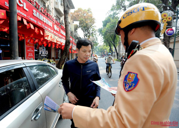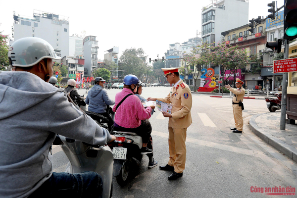 Tổ công tác CSGT làm nhiệm vụ tại nút giao thông Điện Biên Phủ - Hàng Bông. Quá trình thực hiện công tác đảm bảo TTATGT, cán bộ, chiến sĩ cũng tổ chức phát tờ rơi tuyên truyền luật giao thông đến người dân và du khách.
