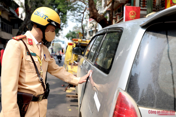 Đội CSGT số 1 cùng Công an phường Hoàn Kiếm xử lý một trường hợp đỗ xe sai quy định trên tuyến đường "Ba nhất".