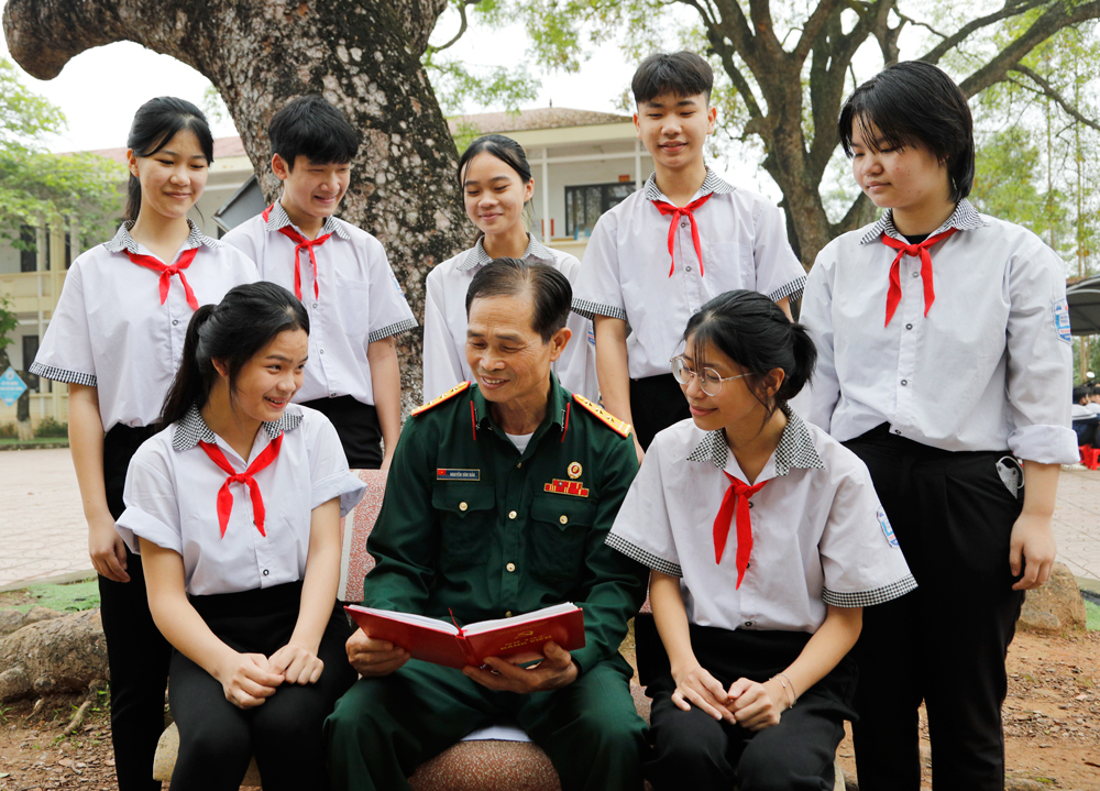 Học sinh Trường Trung học cơ sở Dương Đức, xã Mỹ Thái nghe thương binh Nguyễn Văn Bảo kể chuyện truyền thống.