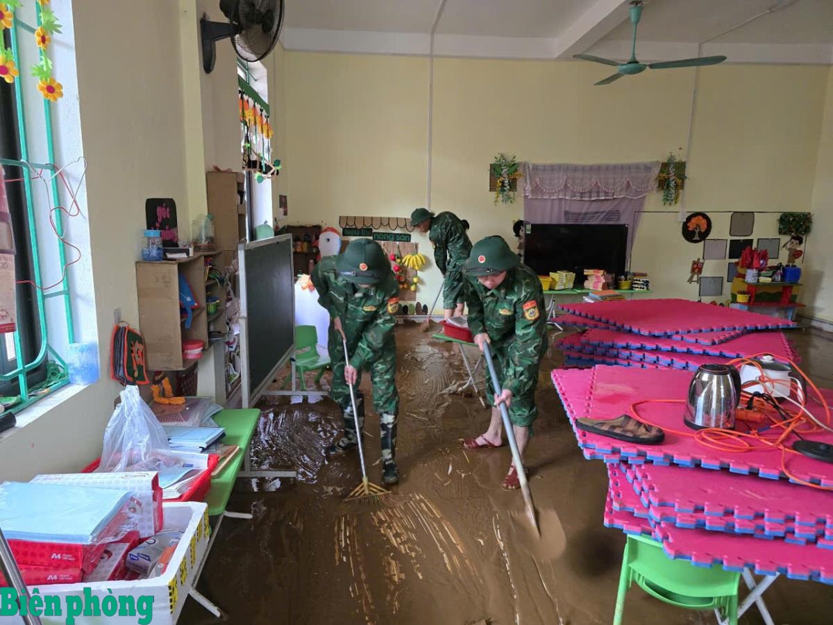 Cán bộ Đồn Biên phòng Xuân Trường, Bộ đội Biên phòng tỉnh Cao Bằng hỗ trợ người dân khắc phục hậu quả mưa lũ. Ảnh: Huy Dương