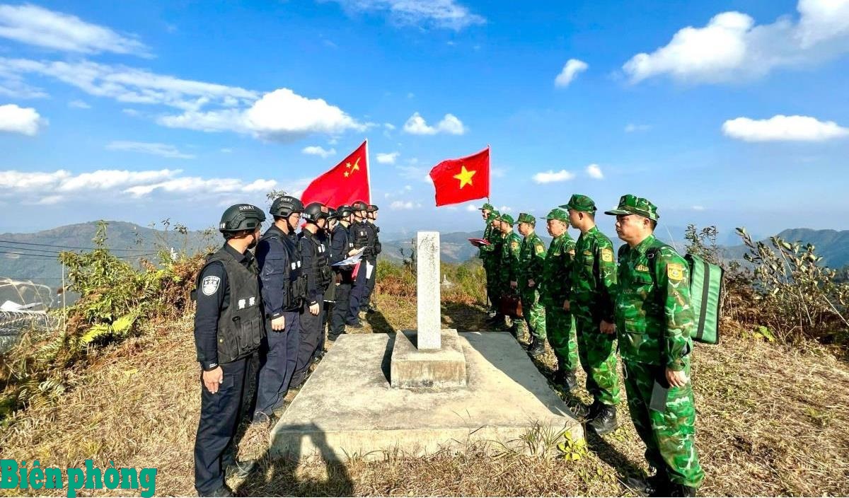 Cán bộ, chiến sĩ Đồn Biên phòng Lũng Cú, Bộ đội Biên phòng tỉnh Tuyên Quang phối hợp với Đội tuần tra của Đồn Công an biên cảnh Đổng Cán, Phân trạm Mã Lâm, Tổng trạm Thiên Bảo (Trung Quốc) tổ chức tuần tra liên hợp, thực thi pháp luật trên biên giới. Ảnh: Kim Khánh