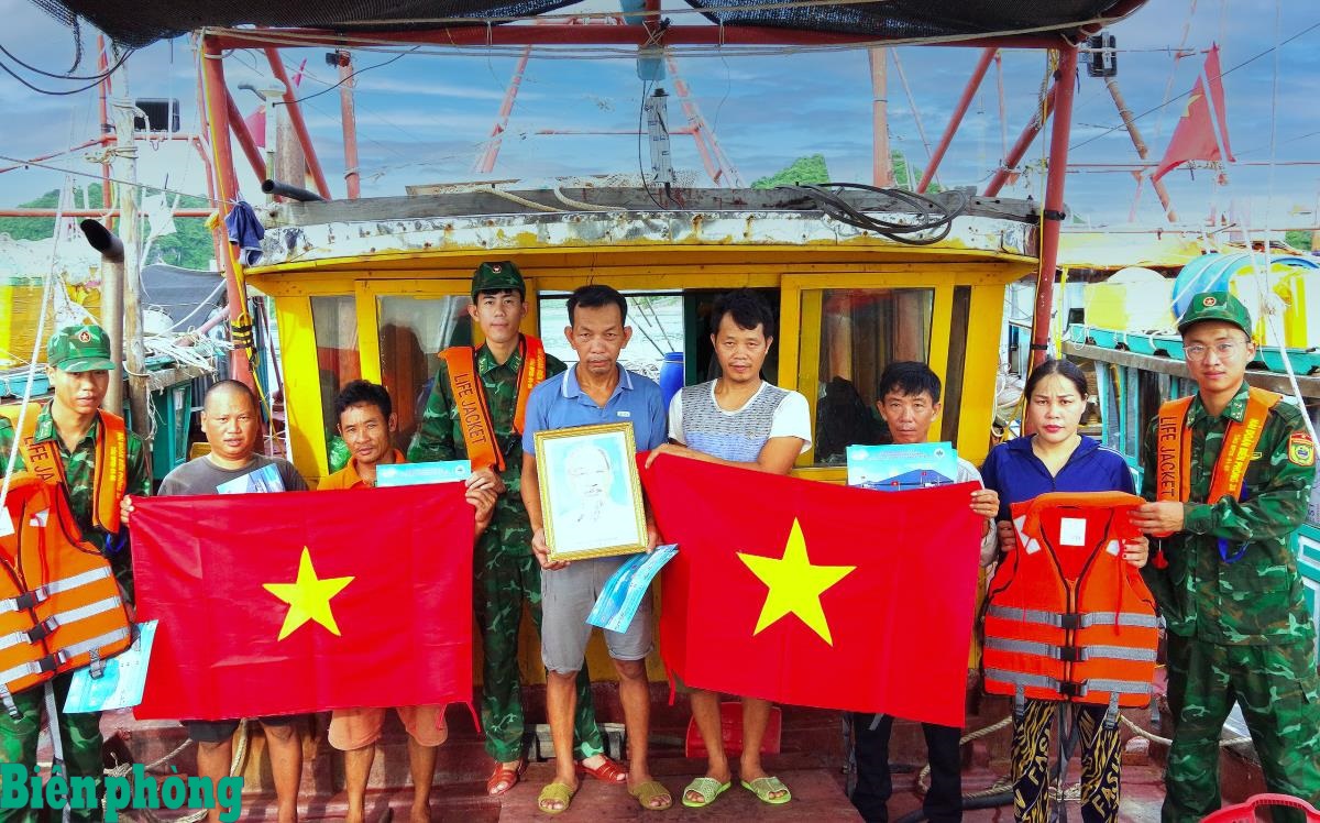 Cán bộ Hải đoàn Biên phòng 38 tặng cờ Tổ quốc và ảnh Bác Hồ, động viên ngư dân vươn khơi, bám biển. Ảnh: Văn Vinh
